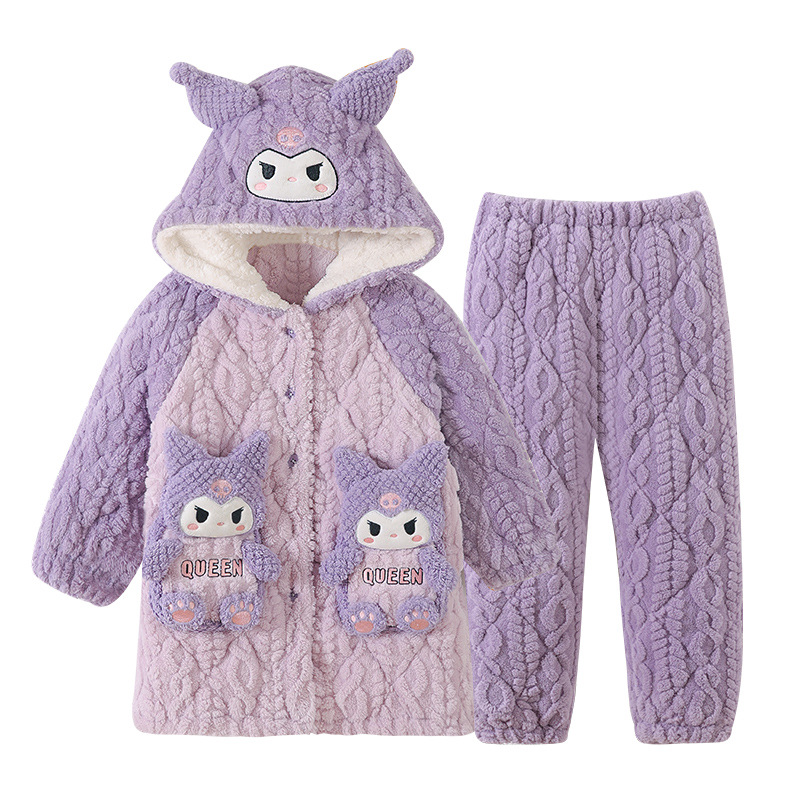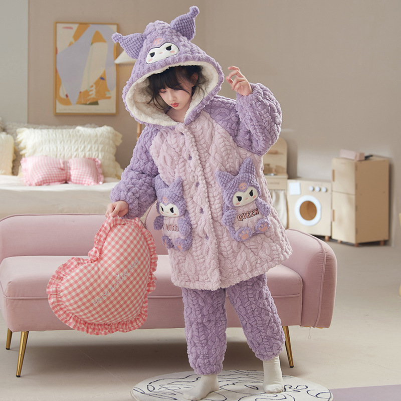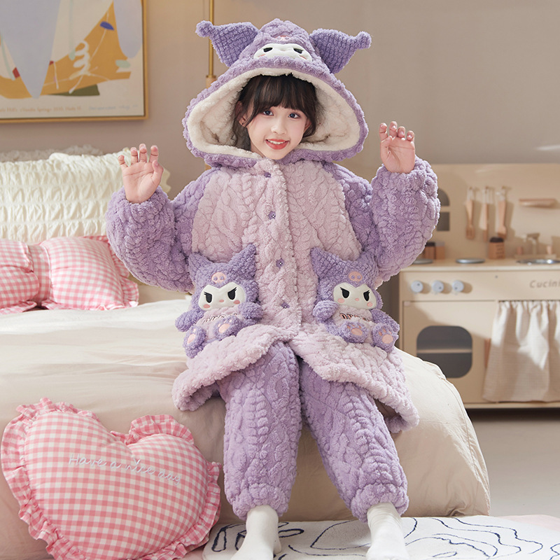 Children's pajamas girls three-layer quilted coral fleece thickened hooded nightgown
